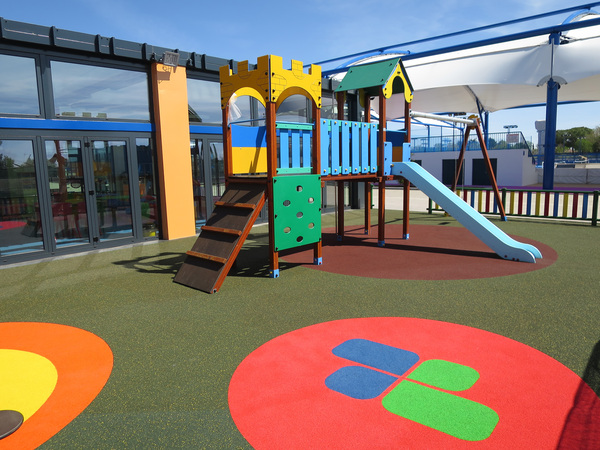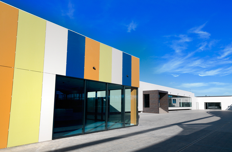 Los edificios formados por prismas de geometría abstracta y que se abren a una gran plaza central, albergan en su interior una zona de control, cafetería, bolera, tienda, oficinas, gimnasio, vestuarios y ludoteca.